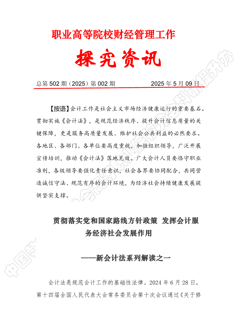 探究资讯502:贯彻落实党和国家路线方针政策 发挥会计服务经济社会发展作用——新会计法系列解读之一 来源: 发布时间:2025-05-19 09:04:04 浏览次数: 次 【字体:小 大】 终审:杨萍 分享到: 【打印正文】