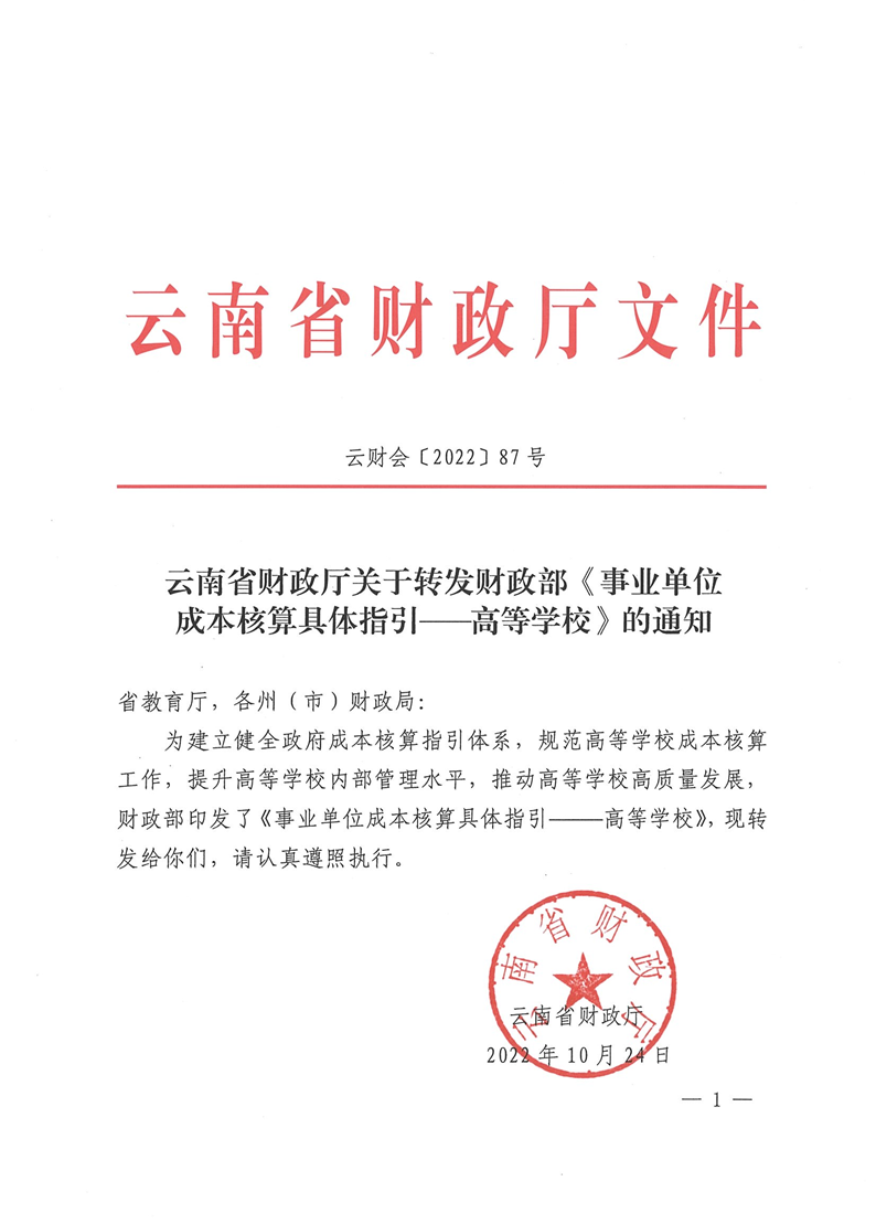 云南省财政厅关于转发财政部《事业单位成本核算具体指引——高等学校》的通知