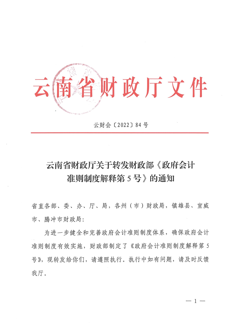 云南省财政厅关于转发财政部《政府会计准则制度解释第5号》的通知