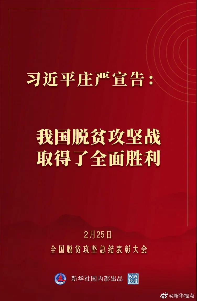 习近平庄严宣告:我国脱贫攻坚战取得了全面胜利 来源:新华社 发布时间:2021-02-25 18:03:51 浏览次数: 次 【字体:小 大】 习近平在全国脱贫攻坚总结表彰大会上发表重要讲话,庄严宣告,经过全党全国各族人民共同努力,在迎来中国共产党成立一百周年的重要时刻,我国脱贫攻坚战取得了全面胜利,现行标准下9899万农村贫困人口全部脱贫,832个贫困县全部摘帽,12.8万个贫困村全部出列,区域性整体贫困得到解决,完成了消除绝对贫困的艰巨任务,创造了又一个彪炳史册的人间奇迹!这是中国人民的伟大光荣,是中国共产党的伟大光荣,是中华民族的伟大光荣! 分享到: 【打印正文】