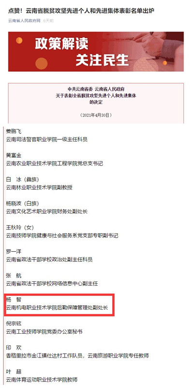 在4月30日上午召开的云南省脱贫攻坚总结表彰大会上,我校驻村工作队员杨智同志荣获“全省脱贫攻坚先进个人”称号。