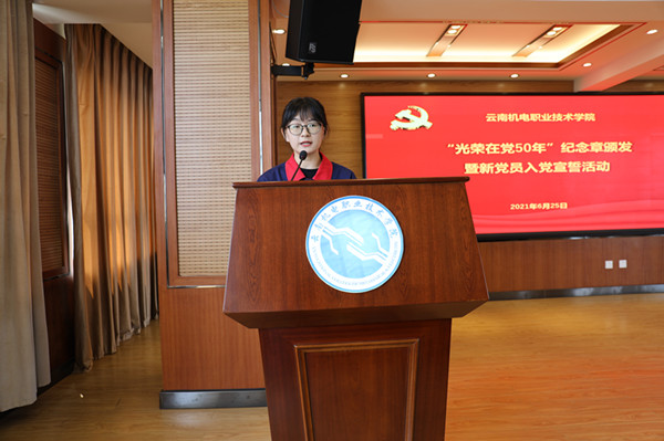 朱成丽同学代表新党员同志发言,表示他们将牢记入党誓言,勇担时代重任,为实现中华民族伟大复兴不懈努力、贡献力量。