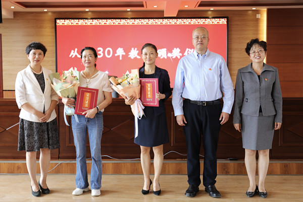 会上,全体参会教师观看了《黄大年 时代楷模》专题片。教师代表杨继玺、董钟慧分别进行了题为《机电教师学党史,为党育人强师风》、《赓续百年初心,担当育人使命》的主题发言。校领导为从教30年的教师代表、获省部级以上奖项教师代表颁发荣誉证书,会后,进行合影留念。