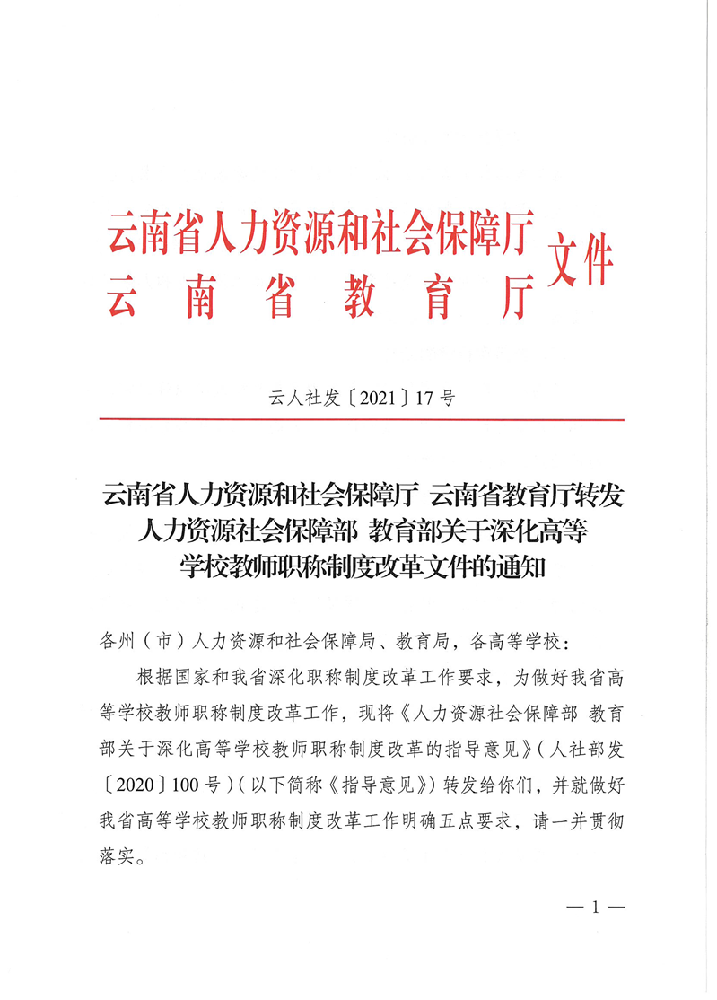 云南省人力资源和社会保障厅 云南省教育厅转发人力资源社会保障部 教育部关于深化高等学校教师职称制度改革文件的通知(云人社发〔2021〕17号) 来源: 发布时间:2021-11-22 14:31:09 浏览次数: 次 【字体:小 大】 分享到: 打印文章