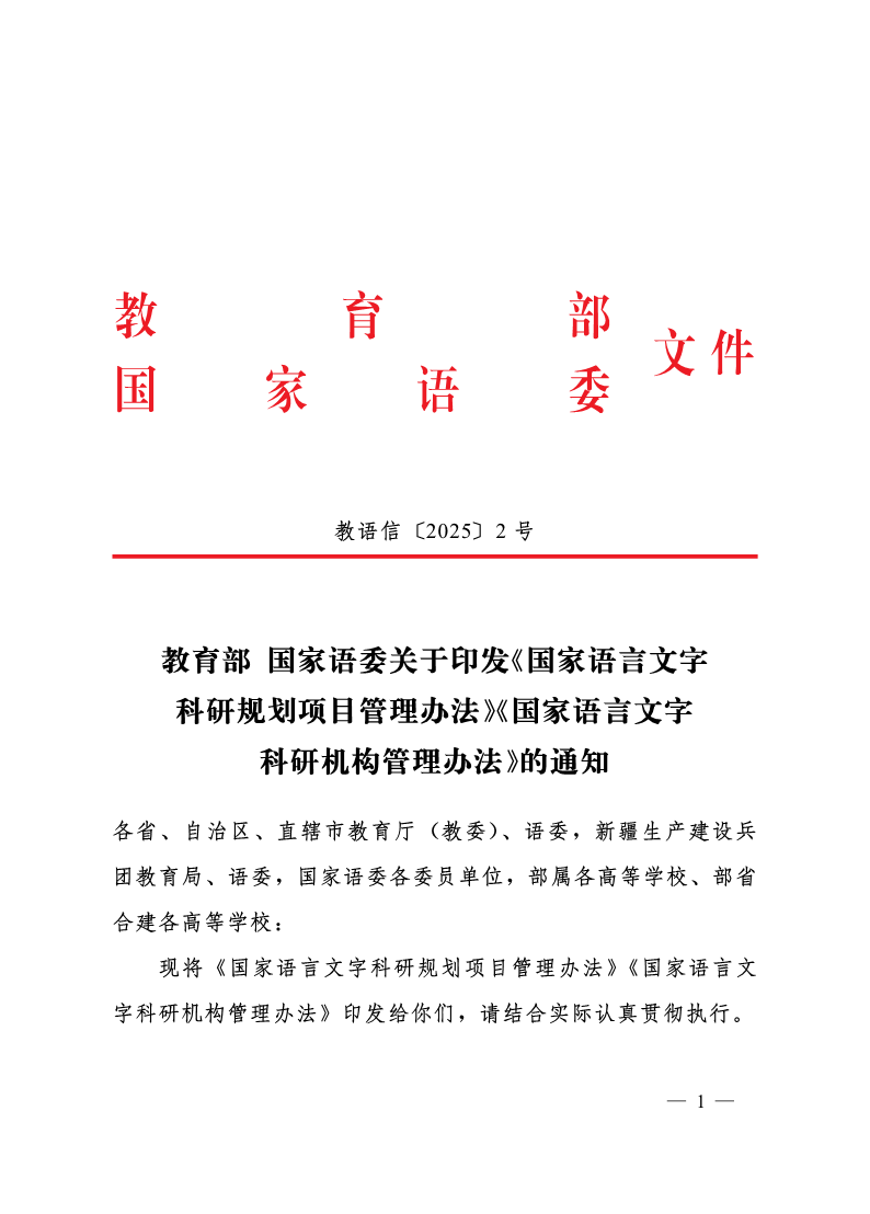 教育部国家语委关于印发《国家语言文字科研规划项目管理办法》《国家语言文字科研机构管理办法》的通知 来源: 发布时间:2025-10-31 10:55:29 浏览次数: 次 【字体:小 大】 分享到: 【打印正文】